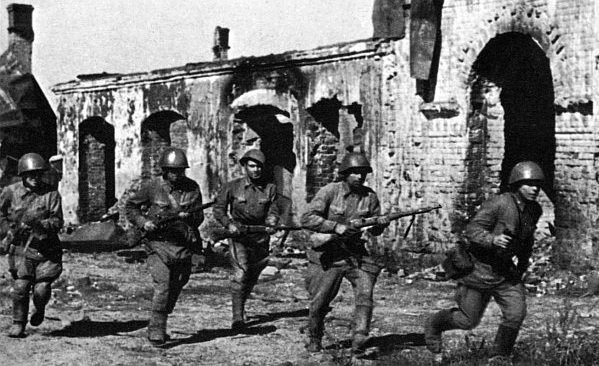 Западный фронт. 4 августа (вторник) в 6.15 , в ходе Ржевско-Сычёвской наступательной операции, при мощной поддержке артиллерии и авиации, спустя 5 дней после Конева, нанёс свой удар Жуков. Огонь всех орудий и миномётов двух армий внезапно обрушился на передний край противника в районе Погорелого Городища. Немцев удалось захватить врасплох. В ходе полуторачасовой обработки переднего края оборона 161-й пехотной и 36-й моторизованной дивизий, по выражению генерала армии Гетмана, была «буквально сметена». Заключительным аккордом прозвучал одновременный залп 18 дивизионов «катюш» — около 3600 реактивных снарядов калибра 132 и 82 мм, выпущенных в течение 10 секунд. После такой огневой подготовки, которая длилась полтора часа, ударные группировки 31-й и 20-й армий без особых трудностей прорвали первую и вторую позиции обороны 161-й пехотной и 36-й моторизованной дивизий на фронте до 15 км. До наступления темноты войска первого эшелона продвинулись на глубину 6-8 км, разбив 161-ю дивизию генерала Рекке. Немцы, бросив тяжёлое вооружение, начали поспешный отход, прикрываясь огнём небольших арьергардных групп, минируя дороги и населённые пункты. Подвижные группы обеих наступающих армий к 16 часам переправились через Держу и, не встречая сопротивления, вошли в прорыв. К исходу дня группа генерала Бычковского главными силами вышла в район Старое, Ревякино, а передовыми частями достигла населённого пункта Емельянцево. Группа полковника Армана в это же время подходила к Кондраково, передовые же её части — к Праслово. Наступление продолжалось и ночью. Немецкая авиация все свои усилия направила на их тылы и фронтовые резервы. Несмотря на советское превосходство в воздухе и большие потери, немецкие самолёты, действуя группами по 10-30 машин, всю вторую половину дня 4 августа наносили бомбовые удары. Особенно от них пострадали переправы через Держу. Все они оказались разрушенными. Меры по их восстановлению не были приняты своевременно. Подвижная группа фронта начала выдвижение из исходных районов в 20 часов 4 августа. Все пути оказались забиты обозами, артиллерией, дороги были в исключительно плохом состоянии. Машины, шедшие ночью с затемнёнными фарами, застревали в грязи. Все это тормозило движение. https://files.polkrf.ru/pic_news/795x-/4836.jpg Фото. Оборонительный рубеж Красной армии. 1942 г. |