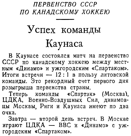 Сыгран первый матч на первенство СССР по хоккею между командой Каунаса и ужгородским «Спартаком» (Украинская ССР). Каунас, показав более классную игру, обыграл гостей со счетом 12:1 (2:1, 6:0, 4:0). Следующий матч каунасским спортсменам предстоит сыграть в Архангельске с местным «Водником»." |