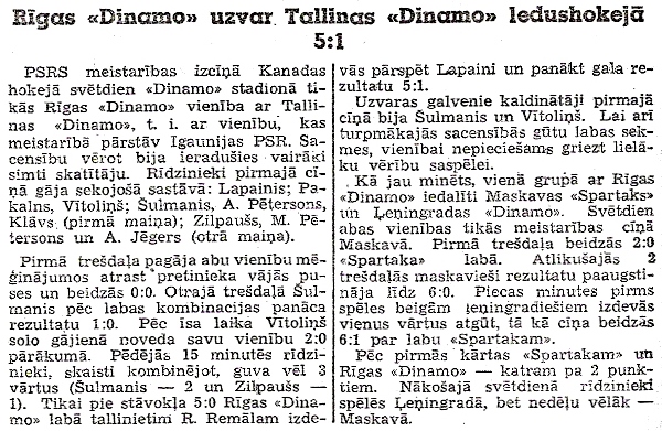 В воскресном матче чемпионата по канадскому хоккею рижское «Динамо» встретилось с командой «Динамо» Таллин, представляющей Эстонскую ССР. Соревнования пришли посмотреть несколько сотен зрителей. Рижане выступали в следующем составе: Лапайнис; Пакалнс, Витолиньш; Шульманис, А. Петерсонс, Клавс (первая тройка); Зильпаушс, М. Петерсон и А. Егерс (вторая тройка). В первой трети матча обе команды безрезультатно пытались найти слабые места соперника - 0:0. Во второй трети Шульманис после хорошей комбинации забил гол - 1:0. Вскоре соло Витолиньша привело к результату 2:0 в пользу хозяев. За последние 15 минут рижане ещё 3 раза поразили ворота гостей (Шульманис - 2 и Зильпаушс - 1). Только при счете 5:0 в пользу рижского «Динамо», Р.Ряммаль сумел обыграть Лапайниса - 5:1. Лучше других первый матч провели Шульманис и Витолиньш, но чтобы добиться успеха в будущих матчах, рижанам необходимо уделить больше внимания лучшему взаимодействию игроков на льду. Как уже упоминалось, в одной группе с Ригой играют московский "Спартак" и ленинградское "Динамо". В воскресенье эти две команды встретились в Москве. Первая треть принесла успех "Спартаку" - 2:0. В оставшиеся 2/3 матча москвичи довели преимущество до 6:0. За пять минут до конца игры ленинградцы смогли забить один гол, итог встречи - 6:1 в пользу "Спартака". После первого тура «Спартак» и рижское «Динамо» имеют по 2 очка. Рижане сыграют в Ленинграде в следующее воскресенье, а через неделю выступят в Москве." |