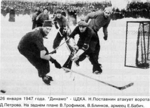 http://www.puckzone.net/history/russia/1947.html Состав команды: вратари — Валентин Григорьев (1919 гр), Дмитрий Петров (1913), защитники — Павел Коротков (1907), Владимир Никаноров (1917), Андрей Старовойтов (1915), Владимир Веневцев (1913), Александр Виноградов (1918), нападающие — Евгений Бабич (01.07.1921), Всеволод Бобров (12.01.1922), Анатолий Гусев (1916), Алексей Ходаков (1927), Владимир Меньшиков (1919), Михаил Орехов (1916), Сергей Рябов (1915), Леонид Степанов (1922), Григорий Тучков (1913), Петр Зенкин (1912). № Дата Где Соперник Счет Результат 1 22.12.46 д ДО Свердловск 5:1 +1=0-0 2 29.12.46 г ВВС МО 5:3 +2=0-0 3 05.01.47 д ДО Ленинград 1:1 +2=1-0 4 21.01.47 д Спартак Москва 1:0 +3=1-0 5 23.01.47 д Динамо Москва 3:2 +4=1-0 6 25.01.47 г Спартак Москва 0:2 +4=1-1 7 26.01.47 г Динамо Москва 1:2 +4=1-2 Шайбы у ЦДКА забрасывали: 16 (11+5): Е.Бабич – 4, В.Бобров – 3, Е.Коротков –2, В.Меньшиков – 2, Л.Степанов – 2, В.Венецев – 1, А.Виноградов – 1, В.Никаноров – 1. Группа А. 22.12.1946. ЦДКА — Дом Офицеров Свердловск 5:1 (0:0, 4:1, 1:0) Голы: Степанов (1:0), Веневцев (2:0), Коротков (3:0), Меньшиков (4:1), Степанов (5:1) — Логинов (3:1). Москва. 4000 зрителей. . . 24-летний нападающий армейцев Леонид Степанов первым открыл счет в поединке, став в итоге автором дубля. Группа А. 29.12.1946. ВВС МО — ЦДКА 3:5 (1:3, 2:1, 0:1) Голы: . . . Москва. . . История не оставила нам всех автором заброшенных шайб, но доподлинно известно, что в своей первой официальной игре в «канадский хоккей» нападающий армейцев Всеволод Бобров, пропустивший первый матч команды, трижды поразил ворота соперников и помог своей команде добиться второй победы, практически обеспечив выход в финальный раунд. Группа А. 06.01.1947. ЦДКА — Дом Офицеров Ленингард 1:1 (0:0, 0:1, 1:0) Голы: П.Коротков (43 мин, 1:1) — Н.Михайлуца (0:1). Москва. . . Армейцы успели завершить поединок вничью, сравняв счет за полторы минуты до конца матча, и благодаря набранному очку финишировали на первом месте в своей группе Финальная группа за 1-3 места. 21.01.1948. ЦДКА - «Спартак» Москва 1:0 (0:0, 1:0, 0:0). Гол: Бабич. Вратари: Петров — Гранаткин. 5000 зрителей. Температура воздуха минус -6. . . Отчет от «Советского Спорта» : С первых минут «Спартак» бросился в атаку и не допускал противника на свою половину. Физическая сильная защита армейцев, которую в этой игре основательно подкреплял впервые выступавший Никаноров, хорошо сдерживала натиск спартаковцев. Во втором тайме армейцы в свою очередь начали атаковать. Но продолжалось это не долго. Инициатива вновь перешла к «Спартаку». Новичков несколько раз набирал скорость и проходил на чужую половину поля. Казалось, вот-вот шайба влетит в ворота армейцев! Но спартаковцам не везло. Вот Новиков обвел всех противников, и зрители приготовились уже приветствовать успех спартаковцев. Однако вратарь Петров блестяще отобрал шайбу. Неожиданно такой же выход сделал Бабич (ЦДКА). Его маневр завершился удачей; он красиво перебросил шайбу через выскочившего из ворот Гранаткина. Счет 1:0. В третьем периоде игра достигла максимального напряжения. «Спартак» все время нападал. Все же один раз Виноградову удалось прорваться к воротам «Спартака». Но он не смог перебросить шайбу через вратаря. Время истекает. «Спартак» напрягает все силы и теснит армейцев к их ворота. Вратарь армейцев Петров, следя за шайбой, падает то в одну, то в другую сторону. Его заставляют буквально вертеться в воротах. Зрители возмущены промахами спартаковцев. Результат так и не изменился. Следует отметить, что игроки до сих пор не овлад