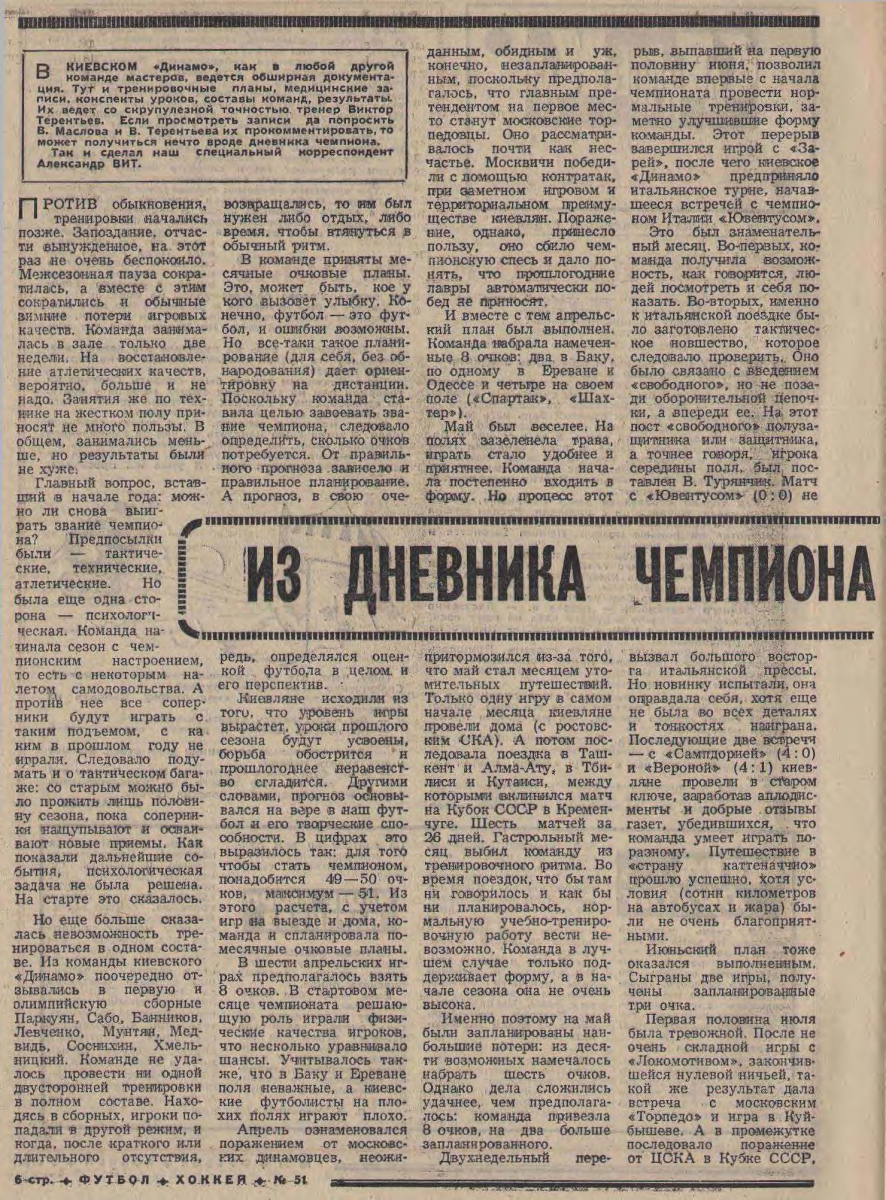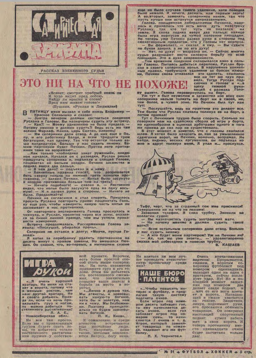 3 декабря 1967 г. Воскресенье No 283 (6019) «ФУТБОЛ-ХОККЕЙ» В НАШЕМ воскресном приложении новость. В сегодняшнем номере рядом с «Футболом» в заголовке стоит «Хоккей». На обложке фотопортрет лидера хоккейных бомбардиров этого года Вячеслава Старшинова. Все первые страницы еженедельника отданы материалам на хоккейные темы. Здесь интервью с председателем федерации В. Д. Алехиным «Чем живет наш хоккей», обозрение «Взгляд из будущего» Е. Рубина, статья О. Сергеева «Кленовые листья» на льду» о положении дел у канадских профессионалов. Отныне наш еженедельник, кроме футбольной темы, будет регулярно вести и тему хоккейную. Это продиктовано растущей популярностью хоккея, желанием многих любителей спорта больше читать об этой интересной игре, желанием мастеров и специалистов иметь печатную трибуну для обмена мнениями, для обсуждения своих проблем. Сегодня хоккейные материалы занимают ровно половину номера. В дальнейшем, планируя номера, редакция всегда будет ориентироваться на значительность событий в футболе и хоккее, на запросы читателей, на актуальность тех или иных вопросов. В разгаре летнего сезона больше внимания и, следовательно, страниц получит футбол, а, например, в феврале, во время Олимпийских игр в Гренобле хоккей. Вполне естественно, характер материалов еженедельника несколько изменится, больше будет помещаться статей, обзоров, путевых заметок, очерков и меньше информации, которую любитель спорта обычно получает в газете «Советский спорт». |
