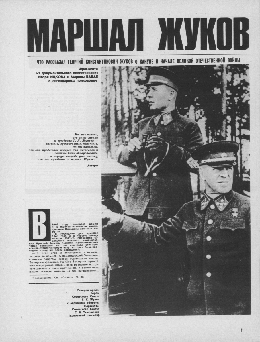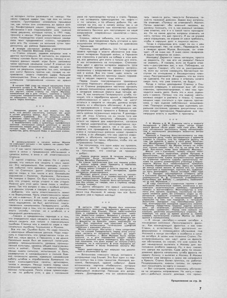 2020-05-28 18:08:00 "Съемки фильма были долгими и трудными. Были трудности и связанные с участием в нем Жукова. Мы понимали ту моральную ответственность, которую взяли на себя, попросив Жукова принять участие в фильме, и ту тяжесть положения, которая возникла бы, если бы по независящим от нас причинам включение в фильм кадров бесед с Жуковым оказалось бы невозможным. Думаю, что это понимал сам Жуков, хотя он ни разу ни словом не коснулся этой темы. Съемки затягивались и переносились. Не хочу входить ни в причины, ни в основательность этих причин, но то место, связанное с историей боев за Москву, где мы первоначально собирались снимать Жукова (о чем ему было известно), как выяснилось, оказалось неприемлемым Для съемок — по мнению тех лиц, от которых зависело решение этого вопроса. А потом одно время стала под сомнение и сама возможность съемок. Тем не менее съемки в конце концов состоялись, правда, не там, где мы сначала предполагали, а дома у Жукова, на подмосковной даче, где он жил уже много лет. Хорошо помню, как, приехав к нему, чтобы договориться о днях съемок и сказать, что их придется делать не там, где мы думали, а у него дома, я с тревогой ожидал вопроса: «Почему?», на который мне было бы трудно ответить. Но Жуков ничего не спросил, только понимающе усмехнулся и сказал: «Ну что ж, на даче так на даче. Как-никак — тоже зона обороны Москвы». Накануне съемок Жукову не повезло. Он был на рыбалке и, поскользнувшись на мокрых мостках, сильно разбил ногу. Ему было трудно ходить, сидеть, вообще двигаться. Но он был готов к съемке и не захотел откладывать её. Ему предстояла трудная задача: рассказать перед аппаратом миллионам будущих зрителей о решающих моментах огромного сражения. Краткий очерк этого сражения, работу над которым он в то время заканчивал, все-таки составлял девяносто страниц на машинке. А мы еще просили у него некоторые живые подробности тех дней, не входившие в этот краткий очерк. В предшествовавших съемкам размышлениях в его памяти вставали сотни подробностей и обстоятельств битвы. Но из всего этого ему предстояло отобрать лишь наиболее существенное и рассказать об этом перед аппаратом сжато и свободно. Я хорошо представлял себе то напряжение, какого все это требовало. А тут еще вдобавок все время напоминавшая о себе резкой болью травма ноги. Конечно, это лишь деталь человеческого поведения, но меня поразила та железная сосредоточенность, с которой в тот день рассказывал перед аппаратом Жуков о Московской битве, не забывая о ее живых подробностях и в то же время неуклонно проводя то главное, что он намеревался сказать, — историческую правду об остроте сложившегося под Москвой положения и о мере нависавшей над ней опасности". Константин Симонов, "Глазами человека моего поколения". |