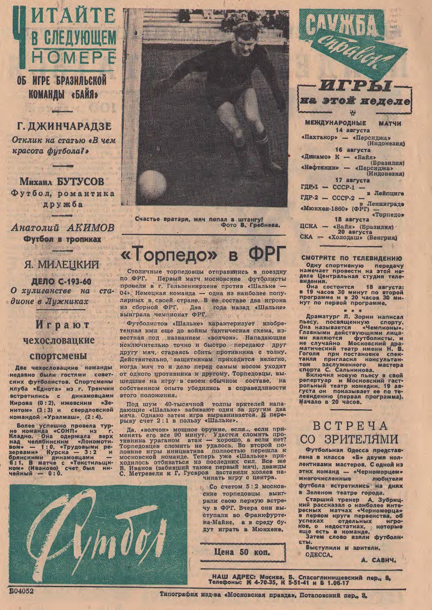 17 августа в Ленинграде на стадионе имени С.М. Кирова состоялся матч вторых сборных команд СССР-ГДР. Игра закончилась со счетом 2:1 в пользу советских футболистов. Вторая сборная команда СССР выступала в новом следующем составе: С. Котрикадзе; А. Крутиков, Г. Рябов, И. Максимов; Ю. Морозов, А. Чертков; В. Смирнов, С. Стадник, Г. Красницкий, Ю. Варламов и А. Васильев.