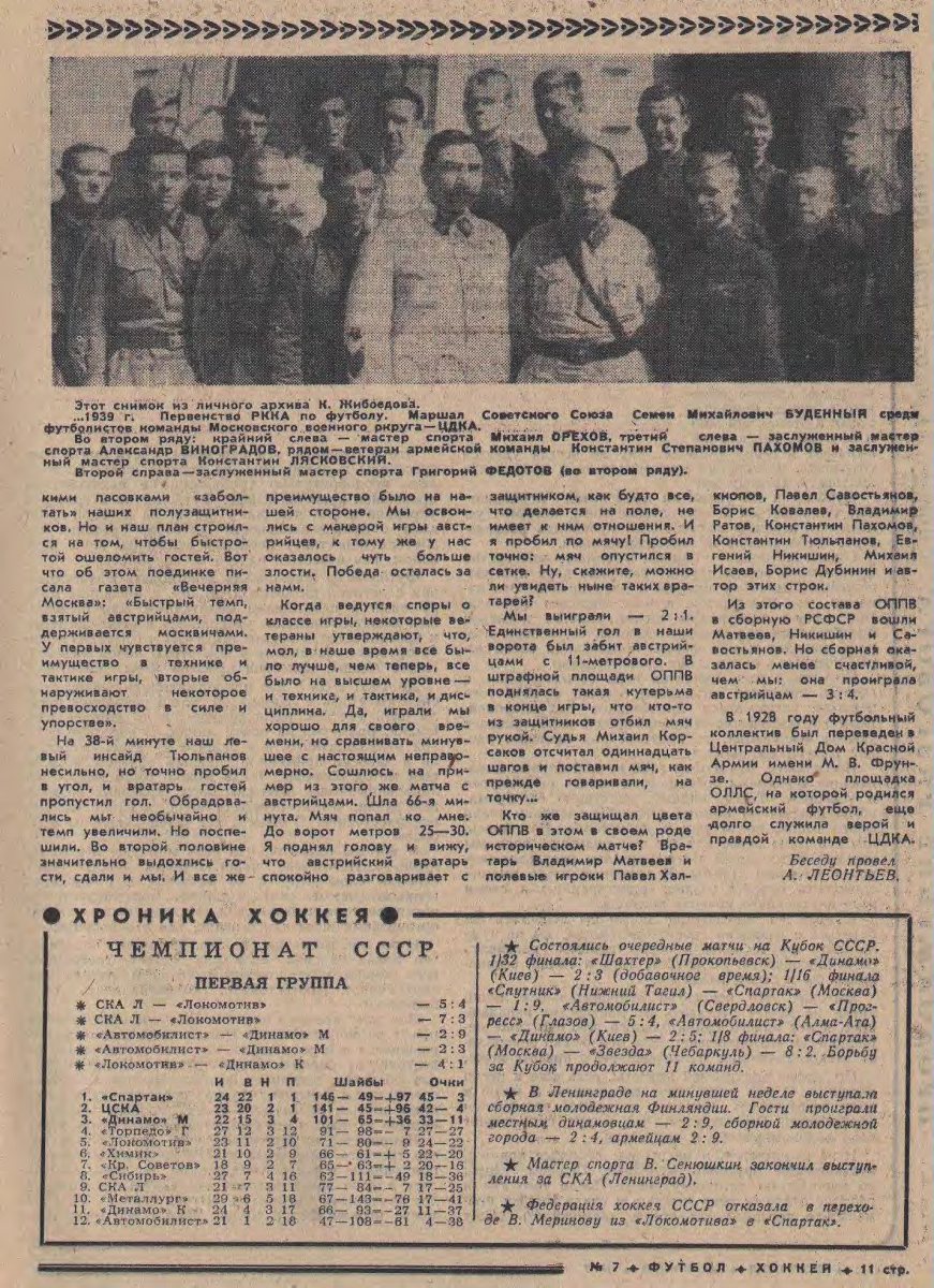 ![]() Уроженец поселка Сулин (с 1926 года – город Красный Сулин). 1930 – 1933 – «Сталь» (Красный Сулин). 1934-1936 – «Буревестник» (Ростов-на-Дону). Октябрь 1936 – весна 1938 - РоДКА / СКА (Ростов-на-Дону). Чемпион Ростова-на-Дону 1937. Весной 1938 года после победы в товарищеском матче РоДКА над ЦДКА Базовой вместе с П.Щербатенко и А Протасовым вызван в расположение ЦДКА. 1938 - 1946 – ЦДКА. В Первой группе (Высшей лиге) за ЦДКА защитник сыграл 60 матчей. В составе главного армейского клуба страны серебряный призер чемпионата СССР 1938, бронзовый призер чемпионата СССР 1939. Сразу после Великой отечественной войны из-за полученной травмы выше дублирующего состава ЦДКА не заиграл. Окончил Высшую школу тренеров. Работал старшим тренером армейцев Свердловска, Новосибирска. Тренером трудился в ЦДСА, серупховской и рязанской «Звезде». Участник Великой отечественной войны. Награжден медалью «За победу над Германией в Великой отечественной войне», медалью «За боевые заслуги», орденом «Красной Звезды». Демобилизован из ВС СССР в 1963 году в звании майора. Мастер спорта СССР. Ушел из жизни в 1995 году… На снимке – 1940 год. ЦДКА. Справа защитник армейцев А.Базовой. |