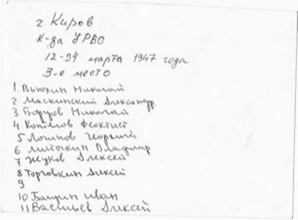 Командная фотография команды УрВО (фактически - Дома Офицеров Свердловск), сделаннаю в марте 1947 года на турнире по хоккею с мячом в Кирове.