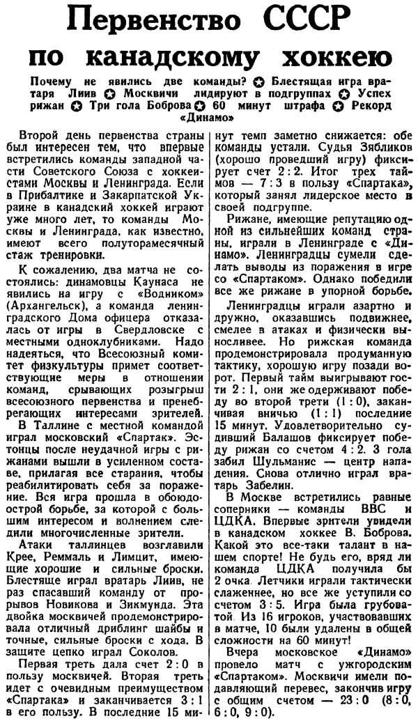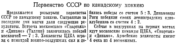 "Сегодня, после длительного перерыва, в Таллине пройдет масштабное спортивное событие - хоккейный матч между знаменитым московским клубом «Спартак» и сборной Эстонской ССР в рамках всесоюзного первенства. Соревнование, вызывающее у любителей спорта большой интерес, состоится в 12 часов дня на льду пруда парка Кадриорг. Вчера игроки динамовской команды строили на площадке необходимые бортики, и приводили место для соревнований в должный вид. Вход на игру бесплатный. Сегодняшняя игра особенно ценна тем, что впервые одна из лучших хоккейных команд Москвы и СССР примет участие в соревнованиях, проходящих в Эстонии. Погода в Москве позволила гостям приступить к тренировкам почти полтора месяца назад, и "Спартак" достиг хорошей игровой формы, о чем лучше всего говорят победы 6:1 над ленинградским «Динамо», 9:1 над московским «Динамо» и 10:0 над командой Московского института физической культуры. В состав московского «Спартака» входит ряд известных на весь СССР спортсменов во главе с капитаном команды змс Виктором Соколовым, мс Морозовым и чемпионом СССР по теннису Зикмундом. В сегодняшнем матче «Спартак» сыграет в следующем составе: вратарь - Белянчиков; защитники - Морозов и В. Соколов; первое звено: Сеглин - Зикмунд - Новиков, второе: Глазков - Захаров - Квасников. Сборная Эстонии проведет матч в ранее объявленном составе. Судит игру ленинградец В. Зябликов."