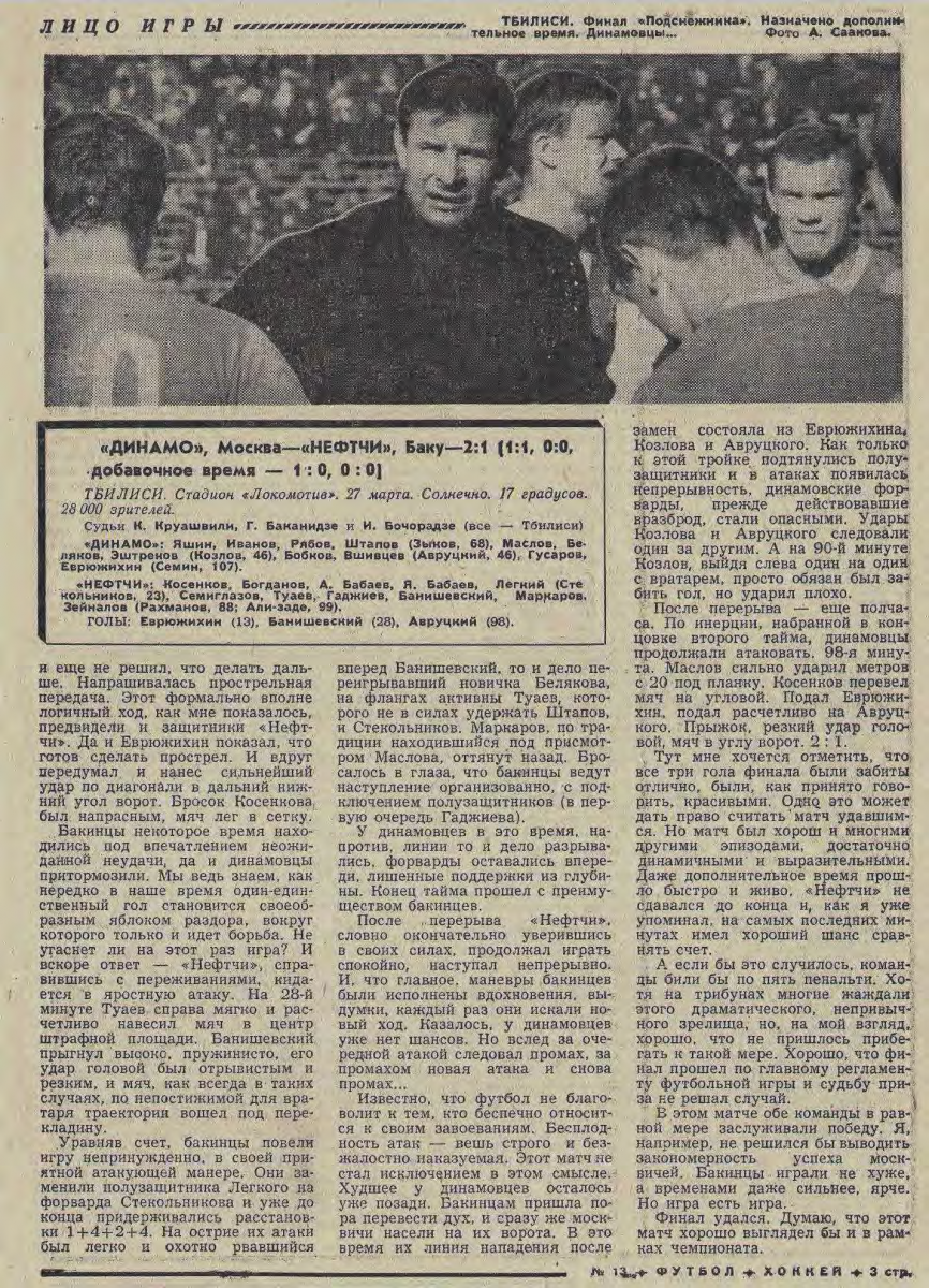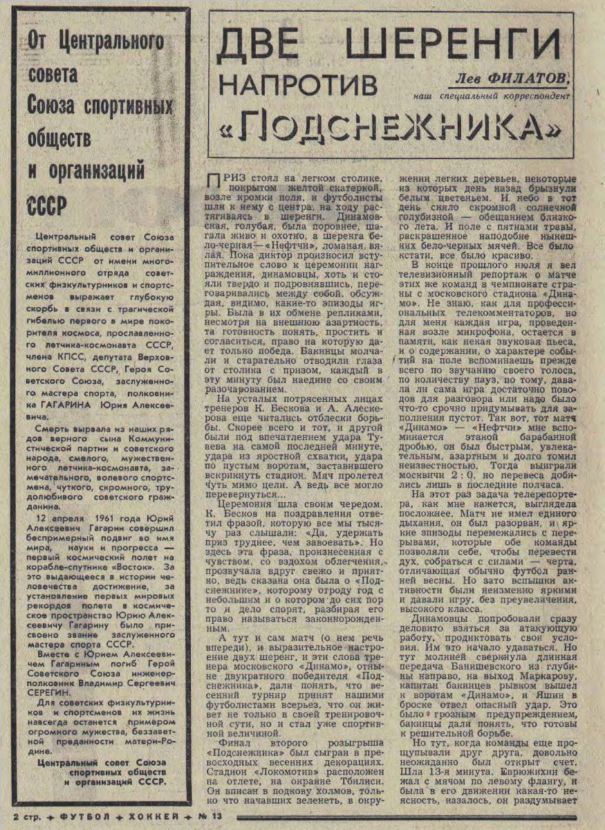 Наибольший интерес вызвали матчи МОСКОВСКОГО «Динамо» с «Пахтанором» и «Кайратом». На каждом из них побывало по 42 000 зрителей. За финальной игрой «Подснежника» на тбилисском стадионе «Динамо» наблюдало 40 000 зрителей. В полуфинальной игре «Торпедо» (Кутаиси) «Нефтяник» (Баку) единственный раз было применено «правило пенальти». Поскольку основное время закончилось вничью 0:0, обеим командам было предложено пробить по пять 11-метровых. Кутаисцы реализовали все пять, а бакинцы два. Обладателем «Подснежника» стало московское «Динамо», цвета которого в финале защищал резервный состав, так как основные игроки находились в зарубежной поездке. Впоследствии участники финальной встречи Суслов, В. Штанов, В. Долбоносов выступали несколько раз основном составе «Динамо», а Б. Леонов оказался самым результативным игроком среди дублеров (19 мячей). Лучшим бомбардиром «Подснежника» стал кутаисец Д. Хажалия (7 голов). Хрустальный приз «Советского спорта» «Подснежник», изготовленный по специальному заказу львовской фирмой «Радуга», , выставлен пока в клубе мастеров московского «Динамо». |