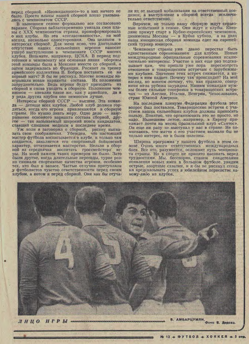 Впрочем, скоро синие тренировочные костюмы чемпионов появятся на Черноморском побережье. пока динамовцы Киева переживают приятные минуты встречи друг с другом после зимнего отдыха и первые соприкосновения с другом-мячом. На переднем плане: Соснихин, Хмельницкий, Щегольков и Медвидь. Фото В. Дедова. |
