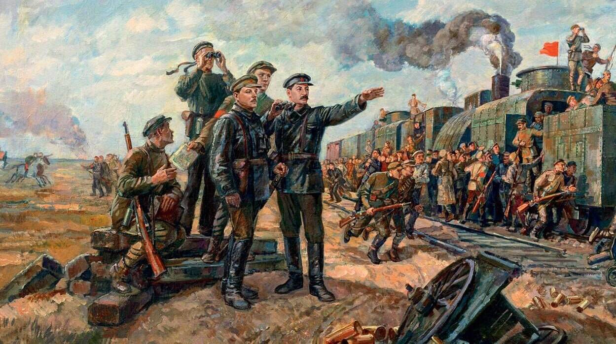10 апреля 1925 года город Царицын переименован в Сталинград – решение царицынских властей. ![]() В. Хвостенко. Сталин и Ворошилов у бронепоезда на Царицынском фронте. 1934 (фрагмент) |