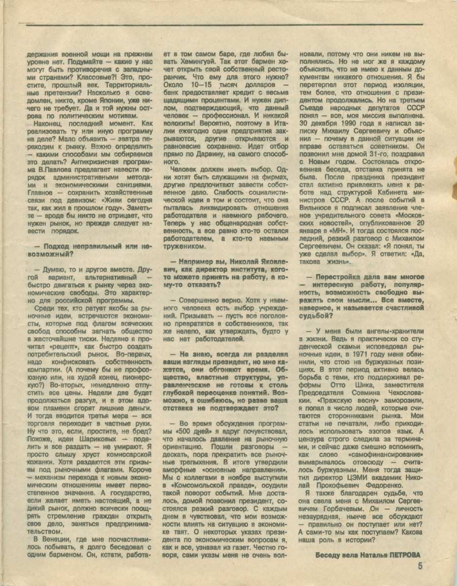 – Вот именно. Наше государство защищает только интересы производителя. Поэтому я противник министерств, которые как раз и являются органами защиты монопольных производителей. Государство должно, наоборот, защищать потребителя и бороться с монополиями. Государство должно защищать интересы частных предпринимателей и кооператоров, поддерживать их с помощью кредитов. Я считаю, что все отраслевые министерства должны быть ликвидированы.