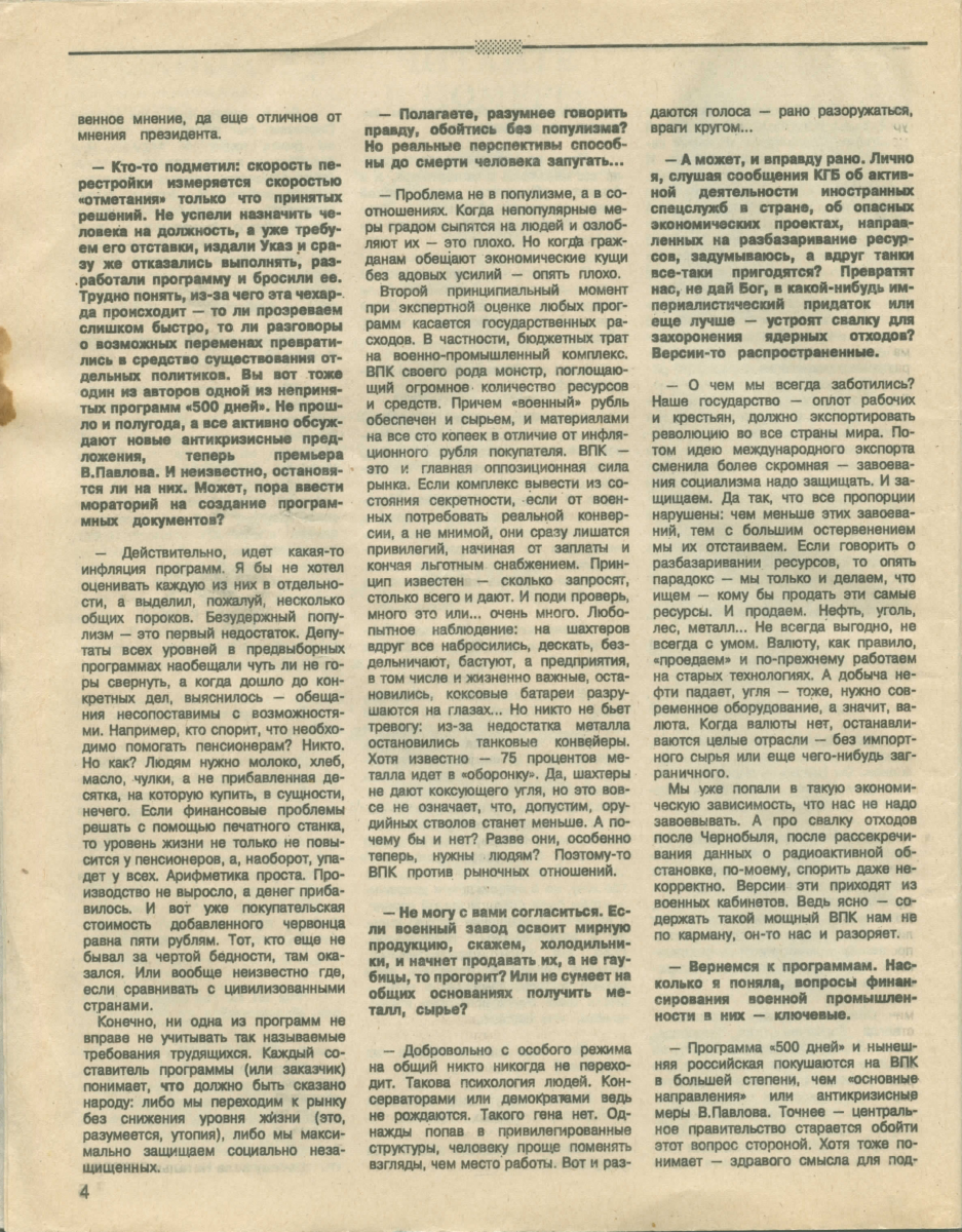 – Мы должны ввести с нашем бюджете режим строгой экономии, по моему мнению, уже со второго полугодия 1990г. Но в этом вопросе я не располагаю поддержкой министра финансов. Необходимо, например, немедленно заморозить многие стройки. Это не приведет к безработице, потому что возможности строительной индустрии значительно меньше, чем объем государственных капвложений. Вторая часть инвестиционной политики состоит в переходе к созданию мелких и средних предприятий.