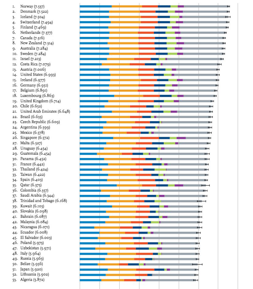 Самые высокие значения так называемого "индекса счастья" зафиксированы в Норвегии, Дании, Исландии, Швейцарии и Финляндии. Во вторую пятерку вошли Нидерланды, Канада, Новая Зеландия, Австралия и Швеция. На 11-ом месте находится Израиль, на 12-ом Коста Рика. Соединенные Штаты сделали шаг назад по сравнению с прошлым годом, с 13-го места на 14-ое. Германия на 16-ом. Великобритания поднялась с 23-го места на 19-ое. Из бывших социалистических стран самое высокое место занимает Чехия - она на 23-ей позиции. Россия поднялась на 7 позиций и занимает 49-ую строку в списке, между Италией и Белизом - самую высокую из стран бывшего СССР. Украина среди постсоветских стран занимает самое нижнее, 132-ое, место, опустившись по сравнению с прошлым годом на 9 позиций. Список замыкают Руанда, Сирия, Танзания, Бурунди и Центральноафриканская Республика. ![]() Индекс составляется на основе вопроса, заданного жителям каждой страны в рамках Gallup World Poll: "Представьте себе лестницу со ступенями, пронумерованными от 0 внизу до 10 наверху. Верхняя ступень представляет собой лучшее, чего вы можете достигнуть в жизни, нижняя - худшее, что может с вами произойти. На какой ступени этой лестницы, как вам кажется, вы в данный момент находитесь?" |