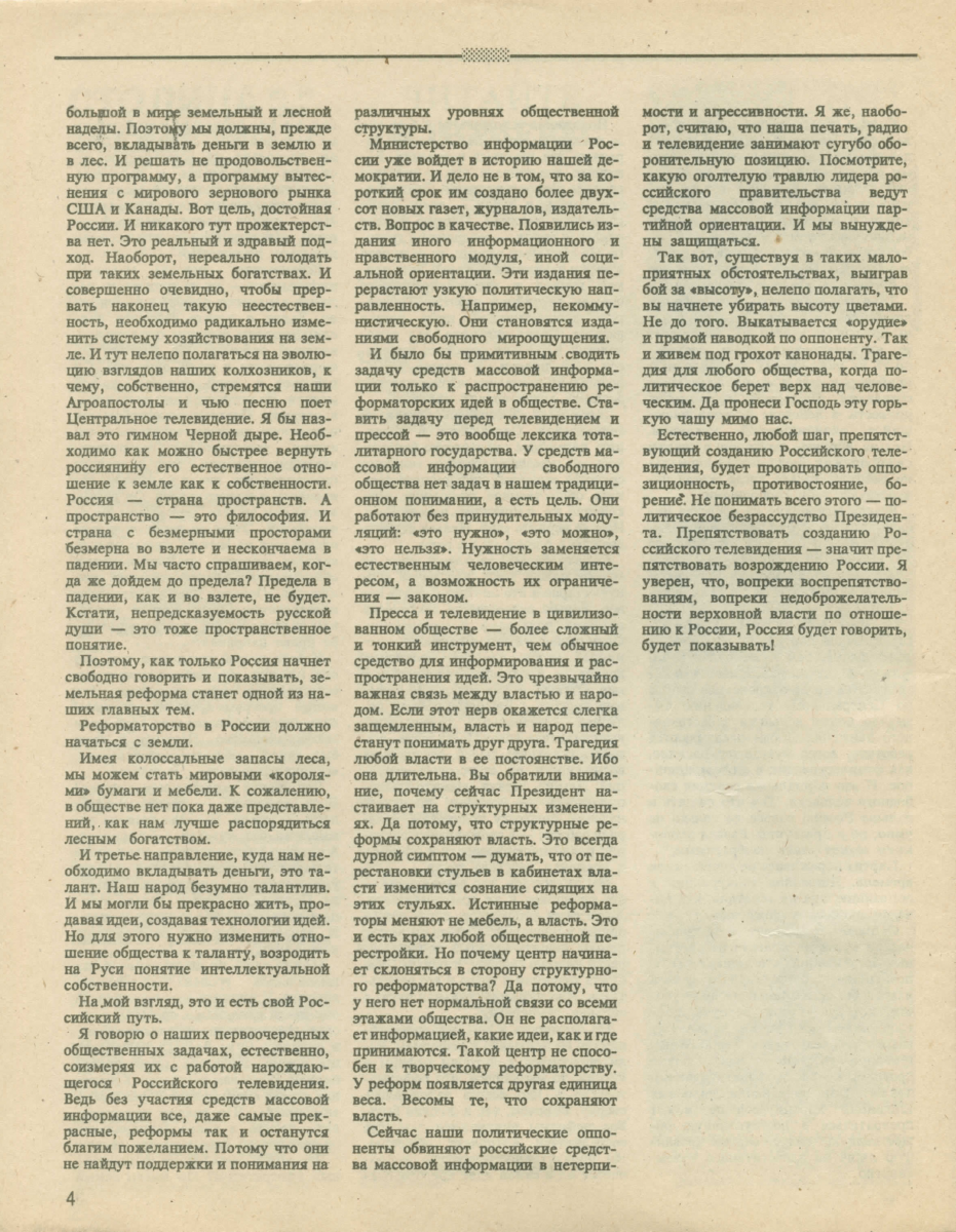 — Есть такая проблема. Нам-то на цифровом телевидении обещали тысячу каналов. Но если речь идет о технологическом прорыве, кто будет делать контент? На нас обрушится такой масштаб графомании и дилетантства, что мало не покажется. Поэтому сделать качественный канал о стране, о жизни регионов очень важно. Ведь, казалось бы, “Россия” должна быть каналом, показывающим провинцию. Но как она ее показывает? Полторы минуты в день, не больше.