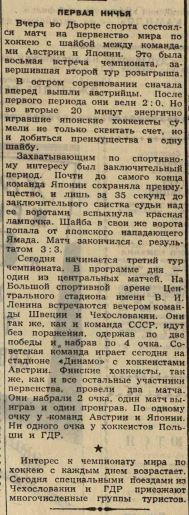 Первую встречу в нынешнем чемпионате мира хоккеисты Советского Союза провели со сборной командой Японии.