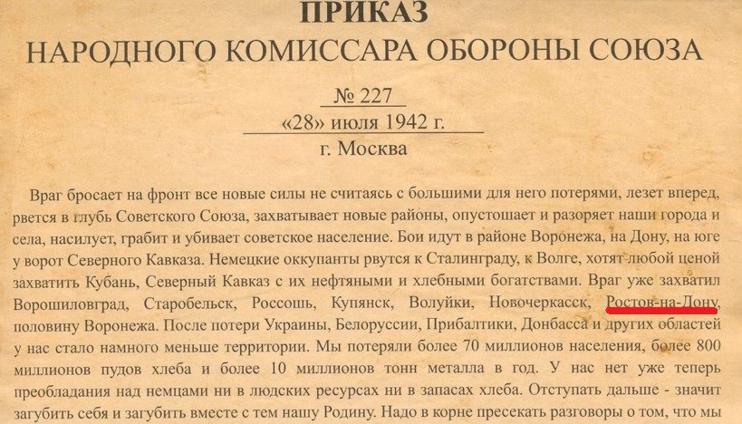 ![]() 28 июля 1942 приказ № 227 Народного комиссара обороны Сталина – «Ни шагу назад!» ![]() На следующий день после сообщения о сдаче Ростова-на-Дону он был упомянут в Приказе №227 «Ни шагу назад!» ![]()