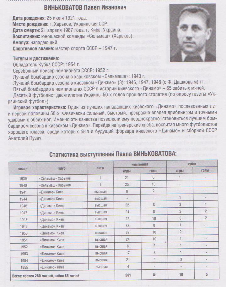 Владимир Бессонов / Vladimir Bessonov (Володимир Васильович Безсонов/Volodymyr Vasilievich Bezsonov) СССРСССР - Полузащитник, защитник. УкраинаУкраина - тренер. Родился 5 марта 1958 года. В 1977 году юношеская сборная СССР стала чемпионом мира, а он был назван лучшим игроком турнира. Потом была «бронза» Олимпиады, «серебро» чемпионата Европы и шесть титулов чемпиона страны. Сейчас Бессонов работает тренером. Vladimir Bessonov © Сборная России по футболу СТАТЬИ: Хотелось бы выиграть со сборной Туркменистана много турниров (Е. Иванников) (2002-09-06) КОМАНДНЫЕ ДОСТИЖЕНИЯ: В составе сборной: Вице-чемпион Европы 1988 года 3-е место на Олимпиаде 1980 года Чемпион Европы среди юношей 1976 года. Чемпион мира среди юниоров 1977 года. «Динамо» Киев, СССР: Победитель Кубка обладателей кубков 1986 года Чемпион СССР 1977, 1980, 1981, 1985, 1986, 1990 годов Обладатель Кубка СССР 1978, 1985, 1987, 1990 годов ЛИЧНЫЕ ДОСТИЖЕНИЯ: Призы игрока: Лучший футболист чемпионата мира U-20 1977 года. (награда FIFA) Третий футболист СССР 1989 года (приз еженедельника «Футбол-Хоккей», по опросу журналистов) Лучший футболист Украины 1989 года. Символические сборные: Входит в список 11 лучших футболистов чемпионата СССР 1978, 1979 годов (Список 11 лучших 1970 - 1979 гг) Входит в список 11 лучших футболистов чемпионата СССР 1980, 1981, 1982, 1985, 1986, 1987, 1989 годов (Список 11 лучших 1980 - 1991 гг) ТОЛЬКО ЦИФРЫ: В составе сборной сыграл 79 матчей, забил 4 гола. Первый матч: 28.07.1977 с ГДР 1:2 Последний матч: 13.06.1990 с Аргентиной 0:2 За олимпийскую сборную СССР сыграл 6 матчей, забил 1 гол. СЕЗОН КЛУБ МАТЧИ ГОЛЫ 1976 (весна) «Динамо» (Киев, СССР) 10 0 1976 (осень) «Динамо» (Киев, СССР) 2 0 1977 «Динамо» (Киев, СССР) 16 1 1978 «Динамо» (Киев, СССР) 23 3 1979 «Динамо» (Киев, СССР) 24 2 1980 «Динамо» (Киев, СССР) 34 5 1981 «Динамо» (Киев, СССР) 25 2 1982 «Динамо» (Киев, СССР) 18 4 1983 «Динамо» (Киев, СССР) 11 1 1984 «Динамо» (Киев, СССР) 20 2 1985 «Динамо» (Киев, СССР) 25 0 1986 «Динамо» (Киев, СССР) 16 1 1987 «Динамо» (Киев, СССР) 11 0 1988 «Динамо» (Киев, СССР) 19 0 1989 «Динамо» (Киев, СССР) 17 5 1990 «Динамо» (Киев, СССР) 7 1 1991 «Маккаби» (Хайфа, Израиль) 5 0 ИТОГО в D-1 283 27 ПЕРИОД КЛУБ СТРАНА 1993 СКА Киев Украина 1994 «Борисфен» Киев Украина 1997 - 2000 ЦСКА Киев Украина 2001 ЦСКА Киев Украина 2002 - 2003 Сборная Туркменистана 2004 - 2005 «Нива» Винница Украина 2006 «Заря» Луганск Украина 2006 - 2007 «Харьков» Украина 2008 - 2010 «Днепр» Днепропетровск Украина ССЫЛКИ: Прочитать про игрока на сайте Википедия Прочитать про игрока на сайте Wikipedia Прочитать про игрока на сайте Сборной России по футболу Прочитать про игрока на сайте Истории Украинского футбола |