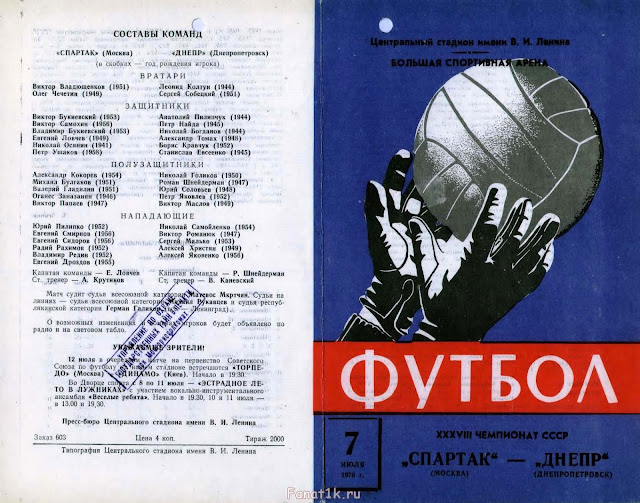 В истории встреч между московскими спартаковцами и «Днепром» самый крупный счет был зафиксирован в 1974 году. Случилось это 19 октября на стадионе «Метеор». Тогда наши футболисты несколько неожиданно потерпели от будущего серебряного призера чемпионата страны крупное поражение со счетом 1:4. Единственный мяч Христян забил во втором тайме, когда счет уже был 2:0 в пользу гостей...