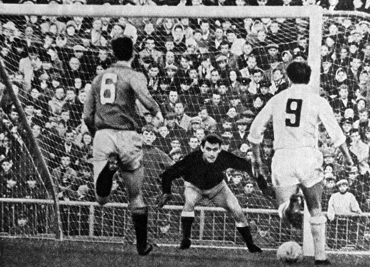 1965 май 2 - ЦСКА (Москва) - «Торпедо» - 0:0 - 95 000 зрителей - острый момент у ворот армейцев... с мячом торпедовец Владимир Щербаков - 9 ... в напряжении голкипер армейцев Йонас Баужа, Николай Маношин - 6 |